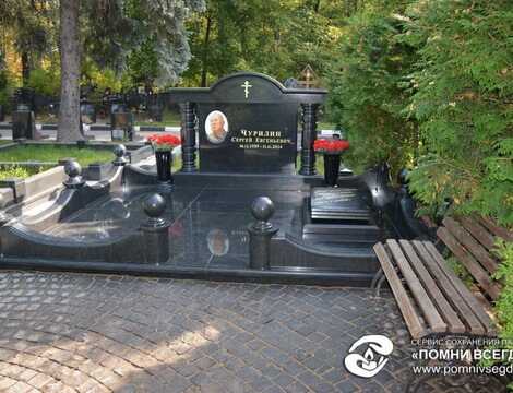 Строгий мемориальный комплекс из черного гранита генерал-майора МВД РФ на Троекуровском кладбище