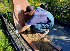 Приехав на кладбище, первым делом мы удалили кустарник, закрывающий памятник. Затем тщательно подмели цветник и территорию участка, после чего вытерли надгробье.