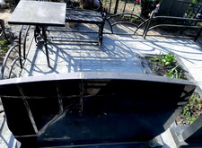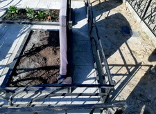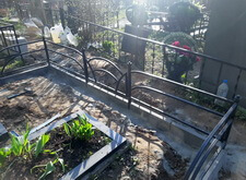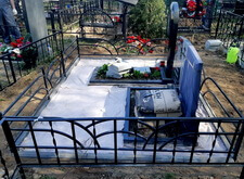 Первым делом мы установили периметр могилы, собранный из бордюрных пролётов. Для этого под оградой была выкопана неглубокая канава, позволяющая надёжно закрепить бетонные плиты в землю. Примыкающие к опорам ограждения блоки были немного подрезаны.