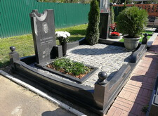 На нижеприведённых фотографиях представлен окончательный вид места захоронения. Мы поставили на место памятник, сделали цветник, уложили внутрь участка гранитную брусчатку. По периметру места захоронения проходит старый цоколь, на этот раз укреплённый на надёжное и добротное основание. В правую половину участка высадили две туи (одну в специальную клумбу, другую в пластиковую кадку), в цветник поместили барвинок. В таком виде объект был представлен клиенту, который остался очень доволен проделанной работой.